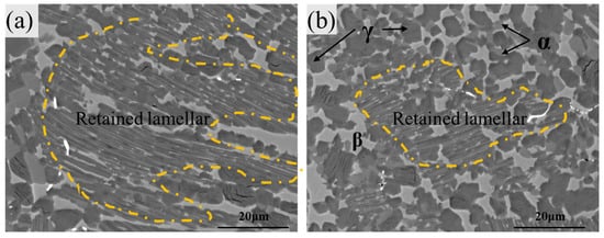 During the pack rolling process, TiAl alloys experience different stress conditions in the center and edge regions, with the edge region being more susceptible to temperature drops due to contact with stainless steel. Therefore, it is important to investigate the microstructure of TiAl alloys in these regions after rolling deformation. Figure 2a shows the microstructure of the edge region of the R7. It can be observed that most of the γ/α2 lamellae are preserved, with the lamellae being twisted and bent. A small amount of spherical β phase and γ phase particles are present around the γ/α2 lamellae, indicating that dynamic recrystallization has occurred at the lamellae interfaces. Figure 2b shows the microstructure of the central region of the R7 sheet, which mainly consists of equiaxed γ, α2, and β phases, along with residual γ/α2 lamellae. The volume fraction of γ/α2 lamellae in the central region is significantly lower than that in the edge region. Compared to the edge region, the microstructure in the central region is more uniform and exhibits finer grains. Compared to the microstructures obtained after Gleeble-3500 thermal simulation of compression at 1200 °C by our research group, the rolled-and-deformed microstructure contains a higher proportion of γ/α2 lamellae and a larger number of equiaxed recrystallized γ phase particles. In contrast, fewer recrystallized α2 phase particles are present [5,19]. This is primarily due to the larger strain rate and higher lnZ (Zener–Hollomon) value during pack rolling [20], which promote dynamic recrystallization within the sheet layer. The appearance of a large number of equiaxed recrystallized γ phase particles can be explained as follows: Pn one hand, the 15-min holding after each rolling pass provides sufficient time for recrystallized grains to grow, leading to the formation of equiaxed γ phase particles. On the other hand, the holding also helps release the stresses generated during the rolling process, which inhibits the γ→α2 phase transformation, resulting in a lower content of α2 phase.
