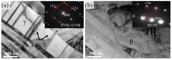 Owing to its high volume fraction, the γ phase undergoes extensive dynamic recrystallization (DRX), which dominates the deformation mechanism during the rolling of TiAl alloy sheets. Moreover, the formation of annealing twins within the γ phase is evident, as clearly revealed in the TEM micrograph of Figure 6a. These twins contribute to strain accommodation during the deformation and subsequent grain growth. The critical role of the β-phase in coordinating deformation is further elucidated by the dislocation configurations observed via TEM in Figure 6b. The presence of dislocations within the β phase (B2 structure) confirms its capacity to accommodate plastic strain by slip, thereby enhancing the overall workability of the alloy by mitigating stress concentrations at the γ/β interfaces [23].