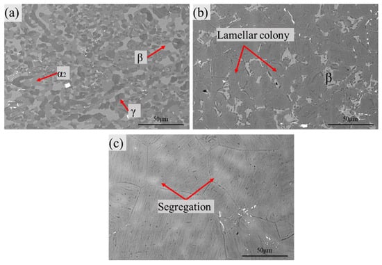 Figure 7 presents the microstructure of the R7 sheet after being held at 1150, 1250, and 1350 °C for 1 h, followed by air cooling. As shown in Figure 7a, after holding at 1150 °C, the microstructure primarily consists of equiaxed γ, α2, and β phases, with the lamellar structure being essentially absent. At 1250 °C, the microstructure transforms from the initial rolled state into a lamellar structure, with a few free β phase particles distributed along the lamellar boundaries. At this temperature, the average lamellar size is 25.7 μm. When the temperature is further increased to 1350 °C, only coarse lamellar structures, ranging from 50 to 100 μm in size, are observed, along with the presence of white deviatoric bands in the microstructure.
