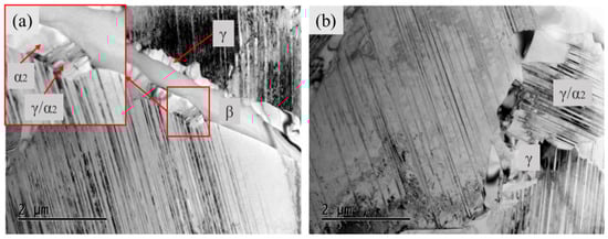 Figure 10 presents the TEM morphology of the R11 sheet after 3 and 9 cycles of heat treatment. In Figure 10a, the γ, β, and α2 grains surrounding the lamellae are clearly visible. Notably, fine γ/α2 lamellar colonies can be observed inside the α2 grains, as highlighted by the red rectangle. The β phase preferentially transforms into the α phase following the expulsion of Ti and absorption of Al, as these two phases are chemically similar, facilitating a rapid compositional change. Subsequently, these α phases transform into γ/α2 lamellae during cooling. Figure 10b presents the TEM morphology after 9 cycles of heat treatment. It can be observed that equiaxed microstructures are almost absent at the lamellar boundaries. A smaller lamellar colony, approximately 2 μm in size, is visible between two larger colonies. This likely represents a lamellar colony whose growth was incomplete following the elimination of the β phase. Analysis of the TEM images (Figure 10) indicates that the interlamellar spacing of the γ/α2 lamellae after nine cycles was approximately 100 nm, significantly smaller than that in the hot-isostatically pressed condition (338 ± 16 nm). During the cyclic heat treatment at 1250 °C, which is slightly above the γ-solvus temperature (Tγsolve, 1247 °C), the microstructure was in a critical state within the α-phase region. During the cooling segment of each cycle, fine γ laths precipitated from the α-phase, concurrent with the α → α2 ordering reaction, leading to the formation of the γ/α2 lamellar structure. In summary, the elimination mechanism of the β phase follows the sequence β → α → γ + α2. This process is collectively driven by the distortion energy and defects introduced by rolling deformation, along with the high temperature and cyclic thermal stresses during heat treatment.