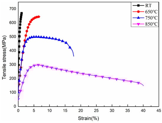 The tensile strengths of the TiAl alloy sheets at 650 °C, 750 °C, and 850 °C were measured as 653.7 MPa, 498.1 MPa, and 301.3 MPa, respectively. The corresponding elongations were 6.8%, 17.5%, and 41.2%. This indicates that the tensile strength decreases while the elongation increases with increasing temperature. The primary reason for this trend is that the thermal activation energy for deformation decreases at elevated temperatures. This reduction facilitates dislocation glide, climb, and twin formation, thereby enabling more extensive plastic deformation. The experimental results reported by Xu et al. [27]. indicate a yield strength ranging from 416 to 440 MPa and an elongation between 7.5% and 11.7%. In contrast, the alloy investigated in this study demonstrates an approximately 11% increase in yield strength and an approximately 80% improvement in elongation compared to those values.