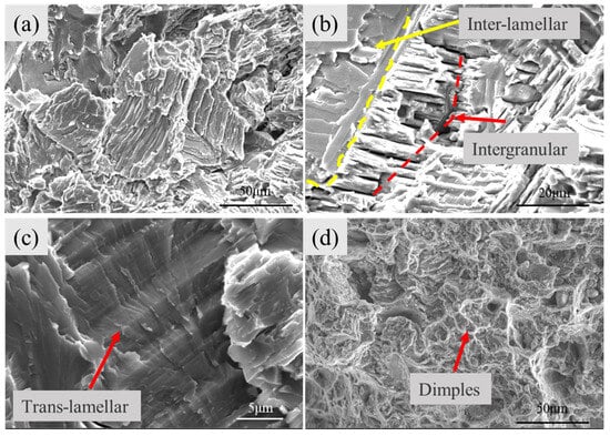 To investigate the fracture mechanism of the TiAl alloy during tensile deformation, its fracture behavior after room-temperature and high-temperature tests was analyzed, as shown in Figure 12. Figure 12a reveals that the room-temperature tensile fracture exhibits characteristics of brittle fracture, involving a mixture of trans-lamellar, inter-lamellar, and inter-granular cracking. In Figure 12b, the small facet in the upper-left corner corresponds to an inter-lamellar fracture, where the crack propagates rapidly along the direction parallel to the γ/α2 lamellae, resulting in a smooth and flat fracture surface. The central region of Figure 12b shows inter-granular fracture, where the crack extends along the interfaces of the γ/α2 lamellae. At this stage, the bending and deflection of the interfaces at their intersections dissipate the crack propagation energy, thereby inhibiting further crack advancement. Previous research [28,29] has indicated that the propagation rate of inter-lamellar cracks is closely related to the lamellar size in TiAl alloys. When the lamellae are relatively coarse, the number of lamellar interfaces and intersections per unit volume is reduced. Consequently, the crack propagation rate along the inter-granular path increases. Conversely, in alloys with finer lamellae, a higher density of interfaces exists per unit volume. As the crack advances, it encounters greater resistance at the interfacial intersections, effectively slowing its propagation. This mechanism ultimately enhances the alloy’s plasticity. Figure 12c illustrates the characteristics of a trans-lamellar fracture, where the crack propagates obliquely through the γ/α2 lamellae in a step-like manner. Figure 12d shows the fracture morphology of the TiAl alloy after high-temperature tensile deformation at 850 °C, which is characterized by numerous dimples, indicating a ductile fracture mode.