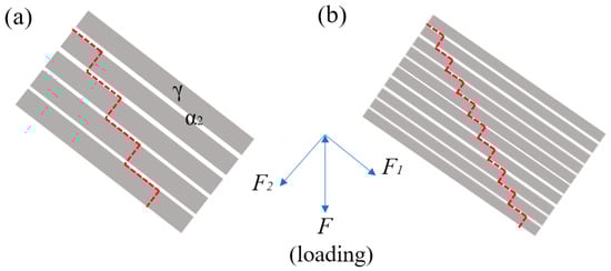 In general, the propagation rate of trans-lamellar cracks is inversely related to the lamellar spacing. Smaller spacing increases the number of γ/α2 interfaces that a crack must traverse per unit advance, thereby enhancing the resistance to crack growth, as illustrated in Figure 13. Additionally, trans-lamellar cracking is favored when the angle between the lamellae and the tensile axis is 40–50°, a phenomenon also observed during the hot compression of a Ti-44Al-4Nb-1Mo alloy [19]. This can be explained by resolving the applied tensile/compressive force into components parallel (F1) and perpendicular (F2) to the lamellae. The component F1 drives crack propagation along the interfaces, while F2 provides the energy to overcome interfacial resistance and propagate the crack through the lamellae. At an orientation angle of 40–50°, F1 and F2 are balanced, facilitating continuous crack propagation. After cyclic heat treatment, the refined lamellar size and spacing in the TiAl alloy reduce the crack propagation rate, thereby improving the alloy’s resistance to crack extension.