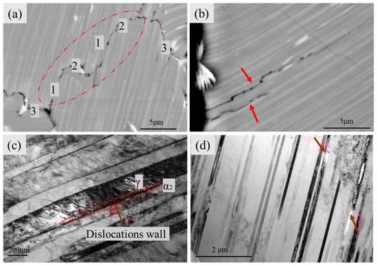 To further investigate the fracture mechanism of the TiAl alloy, the region adjacent to the tensile deformation zone was analyzed, as shown in Figure 14. Figure 14a reveals the presence of multiple cracks. Here, labels “1”, “2”, and “3” denote inter-lamellar, trans-lamellar, and inter-granular cracks, respectively. The series of small cracks labeled “1+2+1+2” in the central area can be collectively considered as a larger trans-lamellar crack (see the red circle). Figure 14b shows the microstructure within the γ/α2 lamellae at 20,000× magnification, where inter-lamellar cracks are seen propagating along the γ/α2 interfaces (gray: γ lamellae; bright white: α2 lamellae). TEM analysis of the lamellar region (Figure 14c) confirms that the wider, dark lamellae are the γ phase, while the adjacent, thinner lamellae are the α2 phase. Within the γ lamellae, dislocations and twins are present simultaneously. High-density dislocation pile-ups are evident at the γ/α2 interfaces, forming dislocation walls. The incompatible deformation between the γ and α2 phases at these interfaces induces significant stress concentration, readily promoting crack initiation, as indicated by the arrow in Figure 14d. Kabir [30] investigated the room-temperature tensile fracture behavior of a TNB alloy heat-treated at 1230–1300 °C and found that cracks primarily initiated at γ grain boundaries, γ/α2 phase boundaries, and the intersections between lamellae and grains. This was attributed to the directional mismatch between individual grains and grain clusters, leading to localized stress concentrations that ultimately resulted in microcracking at the interfaces between the lamellae and spheroidized grains. Regarding crack propagation, as demonstrated in the literature [31], when a crack encounters lamellar bundles within the alloy, its progress is hindered. For the crack to continue advancing, it must either propagate along the interface between the lamellar bundles and the matrix (inter-granular cracking), traverse through the lamellar bundles (trans-lamellar cracking), or initiate a new crack in the γ matrix on the opposite side to release energy. These processes either elongate the crack path or require greater energy, thereby increasing the difficulty of crack extension. In conclusion, the fracture of the alloy after thermal cycling exhibits a mixed mode, involving inter-lamellar, trans-lamellar, and inter-granular cracking. Among these, interlamellar cracking originates from dislocation pile-up at the γ/α2 interfaces within the lamellar structure.