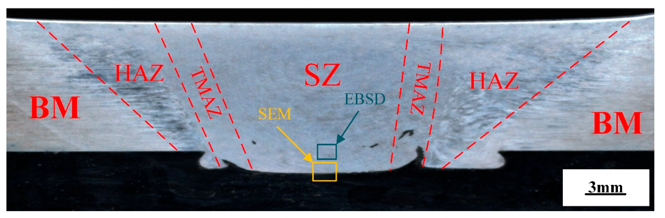 - Anaman, S.Y.; Cho, H.-H.; Das, H.; Lee, J.-S.; Hong, S.-T. Microstructure and Mechanical/Electrochemical Properties of Friction Stir Butt Welded Joint of Dissimilar Aluminum and Steel Alloys. Mater. Charact. 2019, 154, 67–79. [Google Scholar] [CrossRef]