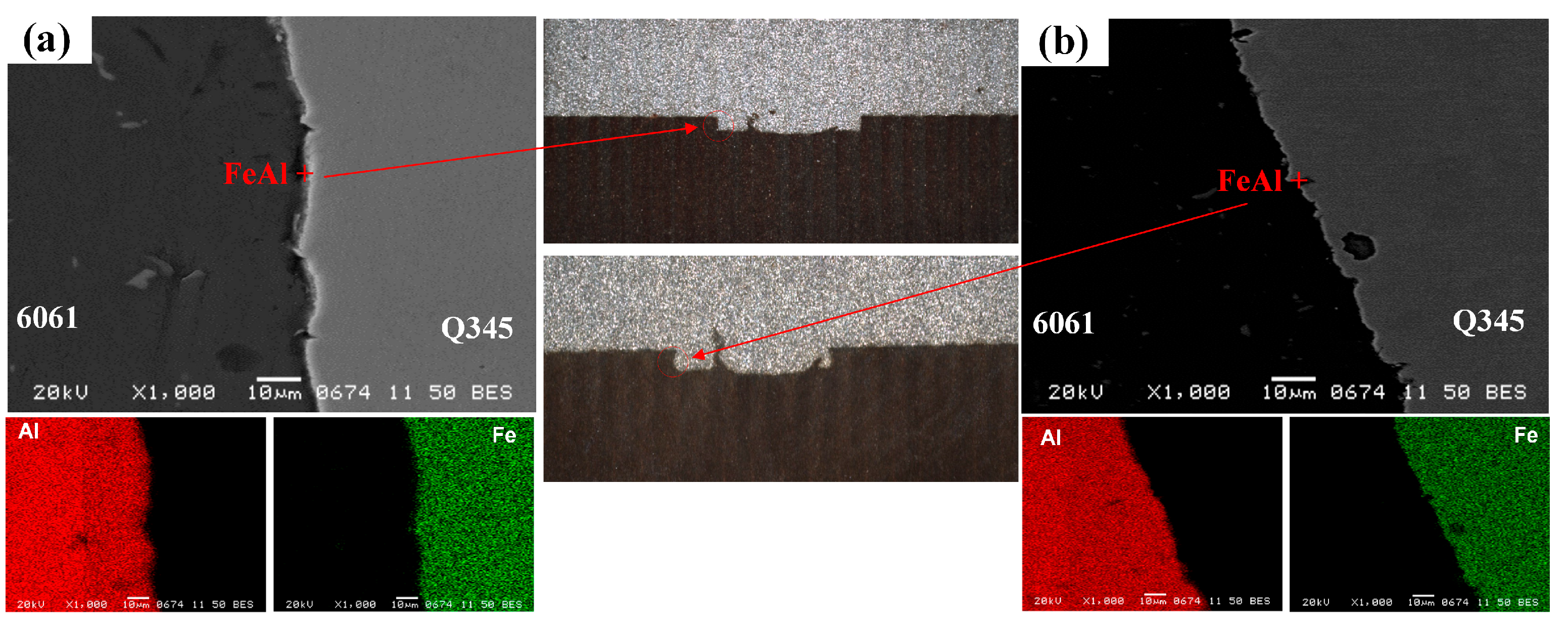 - Wang, H.; Qin, G.; Geng, P.; Ma, X. Interfacial Microstructures and Mechanical Properties of Friction Welded Al/Steel Dissimilar Joints. J. Manuf. Process. 2020, 49, 18–25. [Google Scholar] [CrossRef]