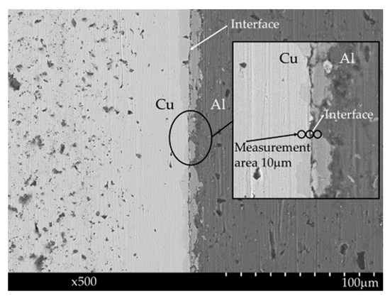 The Al2p spectrum can be clearly observed in Figure 6a, while the Cu3p spectrum cannot be observed. Figure 6b also shows that the Cu2p spectrum can be observed in the Al region, even 10 μm away from the interface. These results suggest that the diffusion length of the Cu atom in the Al region is approximately several micrometers.