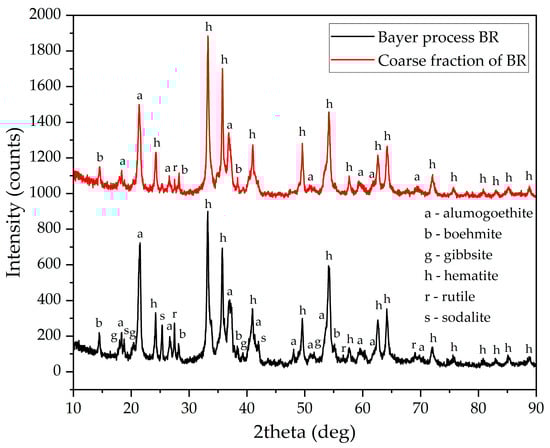 According to the XRD pattern shown in Figure 4 the main iron-containing phases in this BR are hematite and alumogoethite, the latter of which contains almost all undissolved Al. Additionally, as with ordinary BR, this fraction contains residues of boehmite. Unlike common BR, sodalite peaks are not visible in the sands, and there are much fewer rutile and gibbsite peaks, as confirmed by the chemical composition.