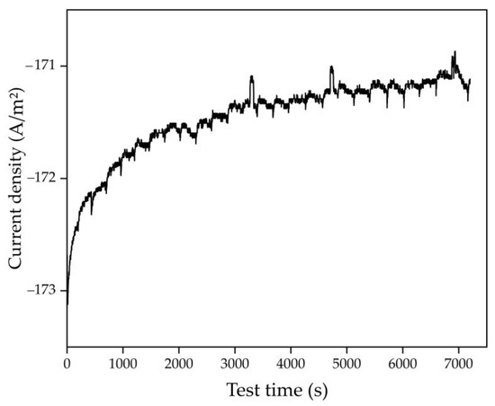 As with a purely alkaline solution [35], when BR is used as the initial material, the cathode currents C1 and C2 are barely distinguishable. However, C2 current, which corresponds to the formation of Fe at a potential of −1.21 V, can be seen. The anode peaks are much more visible as they are not masked by hydrogen evolution. Based on cyclic measurements, the following parameters were selected for reducing iron minerals in sands in a spent Bayer solution: temperature 110 °C; cathode potential relative to the mercury reference electrode −1.21 V; electrolysis duration until complete transformation of hematite into magnetite at 100% current efficiency; and solid concentration 100 g/L. Figure 6 shows the results of potentiostatic measurements during electrolysis over 2 h. It can be seen that the current density gradually decreased during electrolysis, which may be due to the formation of metallic Fe on the surface of the current supply [38].