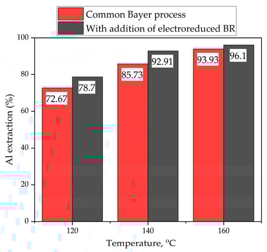 As can be seen, the addition of reduced BR slightly increases alumina extraction, by up to 7.2%. This may be related to the dissolution of alumogoethite and the destruction of sodium titanate that has precipitated onto the surface of minerals [29]. Without reduced BR, the degree of alumina extraction at 140 °C was 85.73%; with reduced sands, it increased to 92.91%. However, the additive increases residue yield, since 50% of the residue (the coarse fraction) is constantly recycled.