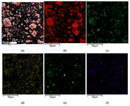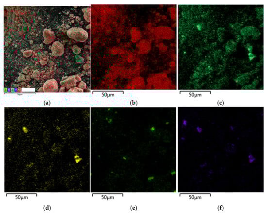 SEM-EDX analysis of the residue after leaching with the addition of the reduced BR: (a) multilayer EDS; (b) map for Fe; (c) map for Al; (d) map for Na; (e) map for Ti; (f) map for Si.