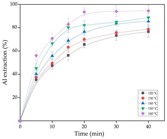 The effect of leaching time and temperature (symbols) on Al extraction from bauxite with the addition of reduced BR.
