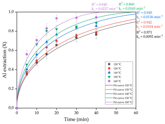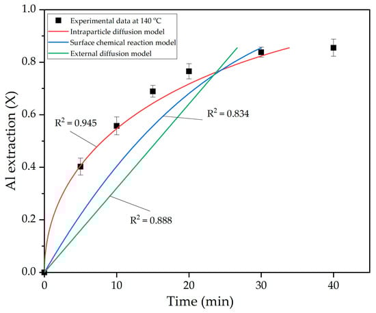 Figure 11 shows that temperature has a significant effect on the leaching rate of bauxite, especially during the first 15 min. After this time, the leaching rate decreases significantly due to the fact that, after 30 min of leaching (Figure 9), practically no gibbsite remains in the solid phase. In other words, the remaining Al is enclosed in boehmite and alumogoethite. These minerals require more time to leach, regardless of the leaching temperature, indicating that diffusion through the layer of unreacted substance becomes the limiting stage of the process. To evaluate this, the experimental data at 140 °C were fitted to various shrinking core model equations (Figure 12).
