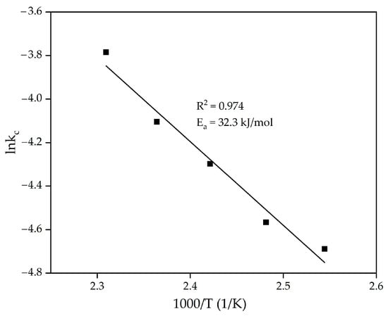 The results of the substitution are shown in Figure 14. As can be seen from Figure 14, the apparent activation energy was found to be 32.3 kJ/mol, confirming that the process is limited by diffusion [42].