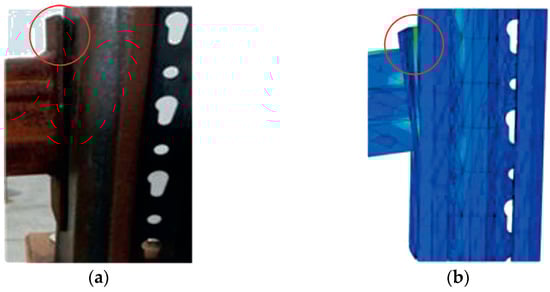 Comparison of the connection failure class A in double cantilever test: (a) experimental test resulted in hook deformation and tearing of the column perforation; (b) FEM simulation of the same failure mode, illustrating the stress concentration zones and deformation contours. (Reprinted with permission from Ref. [9]. Copyright 2010, Elsevier).