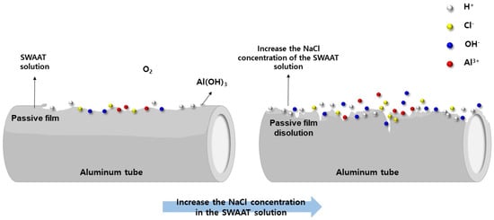 The SWAAT solution primarily consists of NaCl and acetic acid, where chloride ions (Cl−) penetrate the aluminum surface and cause localized corrosion [37,38]. To evaluate the effect of Cl− concentration on the corrosion reaction using an electrochemical method, electrochemical polarization experiments were performed in SWAAT solutions with the change of NaCl concentration from 0 to 10 wt.%. As shown in Figure 1, the corrosion potential (Ecorr) progressively shifted toward more negative values with increasing Cl− concentration, while the corrosion current density (icorr) increased significantly (Table 1).