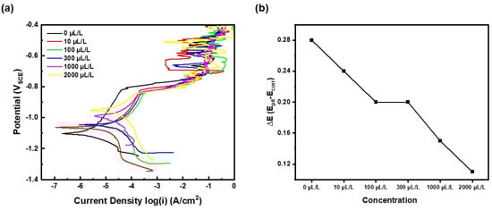 To evaluate the effect of acetic acid concentration on the electrochemical behavior of aluminum, potentiodynamic polarization experiments were conducted in SWAAT solutions containing 0 to 2000 μL L−1 acetic acid. The solution pH showed a gradual decreasing trend with increasing acetic acid concentration (Table 2), reflecting the increase in H+ ion concentration due to acetic acid dissociation. This change in proton activity could indirectly affect the stability of the aluminum passive film [50]. The overall reaction between aluminum and acetic acid can be expressed as follows [51].