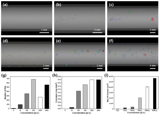 (a–f) XCT analysis of pits after immersion in SWAAT solution with different acetic acid concentrations at 50 °C: (a) 0 µL L−1, (b) 10 µL L−1, (c) 100 µL L−1, (d) 300 µL L−1, (e) 1000 µL L−1 and (f) 2000 µL L−1 acetic acid. Also shown are plots of (g) the number of pits per unit wetted, (h) the corrosion loss per unit wetted area and (i) maximum pit volume as a function of time for immersion test.