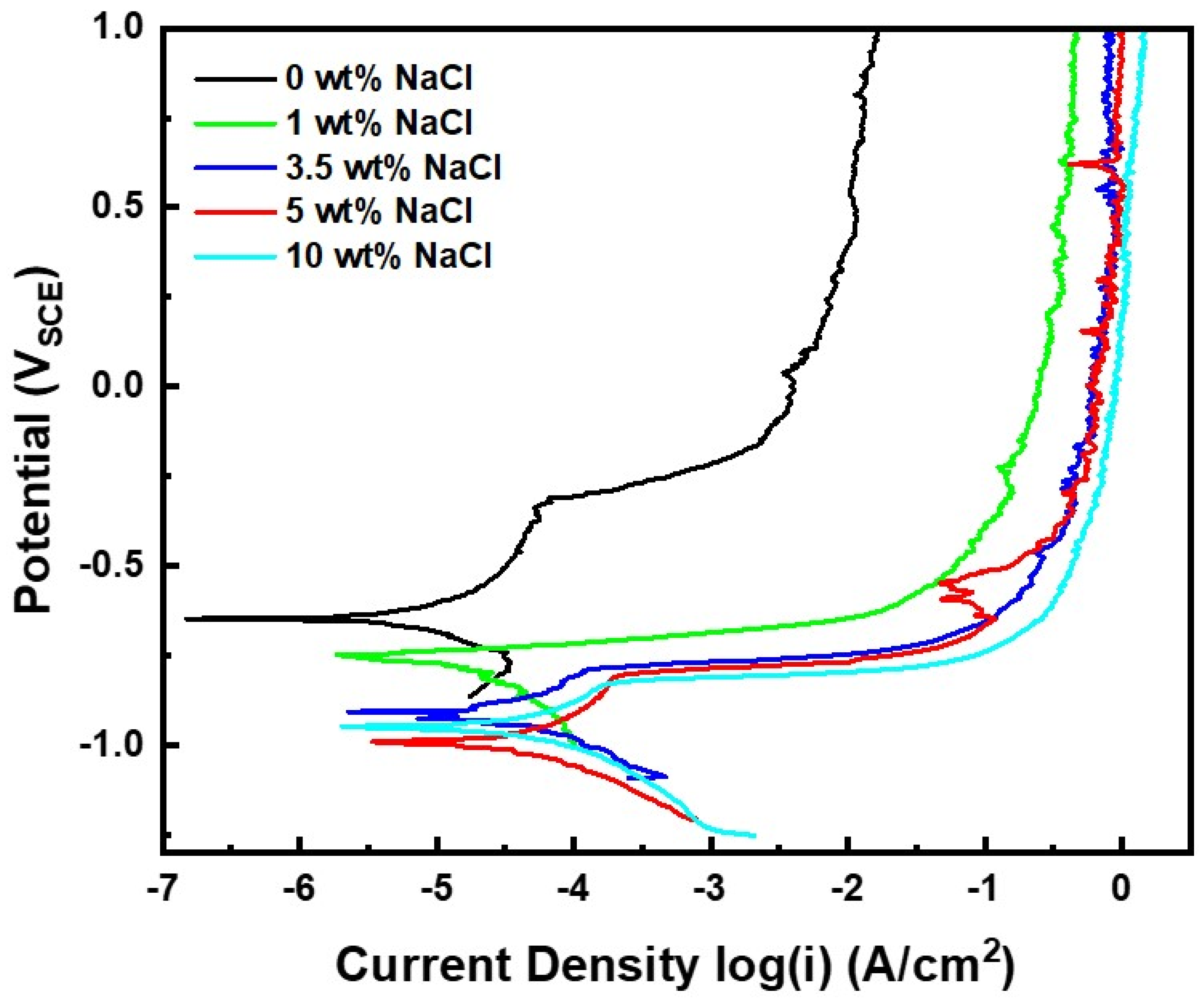 Potentiodynamic polarization curves of Al1070 measured in SWAAT solution containing various NaCl concentrations at 50 °C. All solutions were prepared with acetic acid at a fixed concentration of 300 μL L−1, corresponding to a controlled pH range of 2.8–3.0.