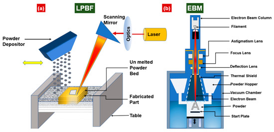 Schematic representations of the PBF-based AM systems (a) LPBF and (b) EBM. Reproduced from [95] with permission from Springer. License Number: 6151671355091.