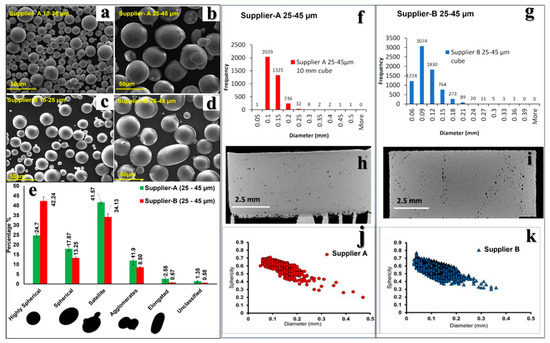 (a–d) SEM images of Ti64 powders from Supplier A and B across different size ranges [108], (e) Powder shape classification for both suppliers. Reproduced from [108], (f,g) µCT-derived defect size distributions in LPBF cubes built using 25–45 µm powders, (h,i) Representative µCT sections showing porosity in cubes from each supplier, and (j,k) Pore sphericity versus diameter, indicating more spherical defects for Supplier A. reproduced from [108,111] (open access articles).