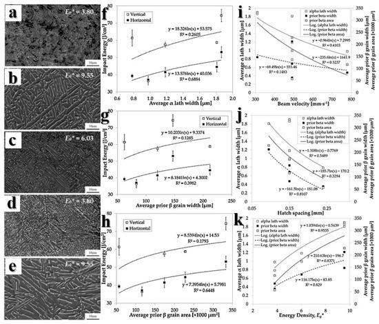Figure 4a–e shows representative build-plane microstructures for the five parameter sets, illustrating how α-lath morphology and columnar prior-β grain structure evolve under different EBPBF conditions. These variations stem from the layer-wise melting and strong thermal gradients inherent to the process, which promote epitaxial β-grain growth and the development of grain-boundary α, including the familiar Widmanstätten platelets and β-colony features. Figure 4f–h illustrate the relationship between impact energy (in both vertical and horizontal directions) and microstructural metrics, including average α-lath width, prior-β grain width, and grain area.