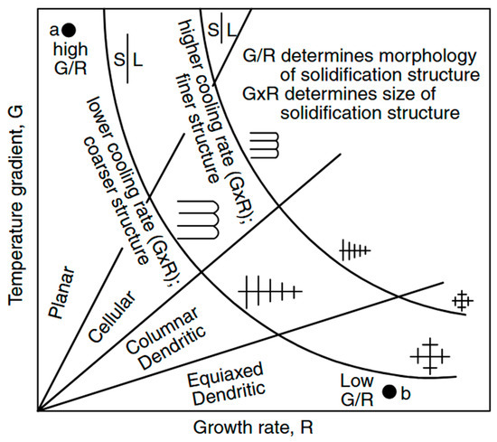 Effect of the temperature gradient (G) and the solidification rate (R) on the resulting microstructural features and size during solidification. Reproduced from [127] with permission from John Wiley and Sons, License number: 6151720658069.