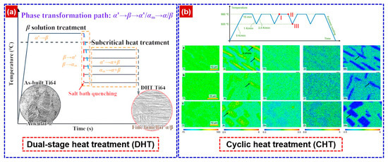 (a) The DHT scheme and phase transformation pathway in LPBF-built Ti64, showing microstructures before and after DHT [152]. (b) Elemental maps of Ti, Al, Sn, Zr, and Mo in LAAM-built Ti6242 during the 980 °C CHT at times I, II, and III [153]. Reproduced from [152,153] (Open access articles).