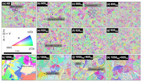 Similarly, HIP not only eliminates internal porosity but also provides sufficient thermal exposure to drive phase transformation toward equilibrium α + β configurations. The kinetics of these transformations depend on factors such as alloy composition, initial α′ fraction, and the extent of prior thermal exposure during deposition. Derimow et al. [142] conducted EBSD analysis on all eleven conditions, including the as-built and ten HIP-treated samples. Figure 7a–k presents the α-phase inverse pole figure (IPF) maps obtained at the same magnification, illustrating distinct morphological variations in the XY orientation. The as-built and sub-β HIP samples (800SC-920RQ; Figure 7a–g) display a rectangular grid-like α morphology, representing solidification traces of the prior β phase formed during PBF-L of Ti64. Within these regions, parallel α-laths form small micro-colonies, accompanied by discontinuous α along prior β grain boundaries, features consistent with earlier studies [154,155]. Continuous grain boundary α is observed only in specimens subjected to HIP above the β-transus temperature (~1000 °C). Chen et al. [156] reported that the competition between grain-boundary and intragranular α nucleation during cooling is highly dependent on the cooling rate in LPBF-built Ti64.