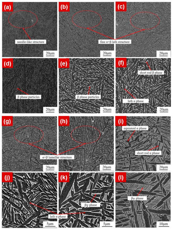 SEM micrographs of heat-treated TA15. As-built TA15 samples were heat-treated at (a) 630 °C, (b) 750 °C, and (c) 800 °C for 2 h; corresponding higher-magnification images are shown in (d–f). L-PBF TA15 samples were heat-treated at (g) 850 °C, (h) 900 °C, and (i) 950 °C for 2 h; corresponding higher-magnification images are shown in (j–l). Reproduced from [217] (open access article).