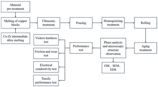 Table 1 presents the raw materials employed in this experiment, along with their morphologies and purities, and the experimental procedure is illustrated in Figure 1. Electrolytic copper blocks were cut, rinsed with alcohol on the surface, and then dried. The masses of Cr flakes and Zr particles were configured based on the chemical compositions of the master alloy and the final alloy material, and the Cu-Zr master alloy was smelted. The alloy with composition Cu-1Cr-0.3Zr was melted by a vacuum ultrasonic high-frequency induction furnace (Model: JZG-3, Bohai University, Jinzhou, China), followed by ultrasonic treatment on the molten alloy. The ultrasonically treated castings were homogenized at 960 °C for 24 h, quenched, and subsequently subjected to 60% hot rolling and 30% room-temperature rolling. Specimens were cut from the rolled material and placed in a muffle furnace (Model: KSL-1200X, Hefei Kexing Materials Technology Co., Ltd., Hefei, China) for aging treatment under different aging parameters, and qualified metallographic samples were finally prepared.