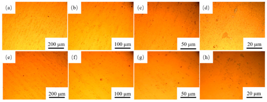 Microstructure images of as-rolled specimens and those aged at 450 °C for 6 h at different magnifications: as-rolled state, (a) ×50, (b) ×100, (c) ×200, (d) ×500; aged state, (e) ×50, (f) ×100, (g) ×200, (h) ×500.