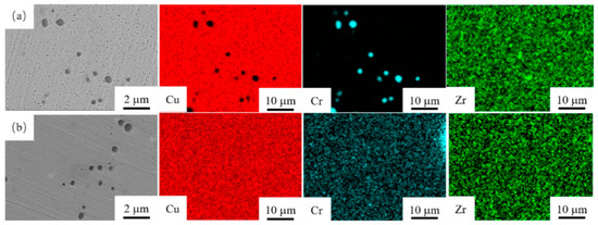 From the surface micromorphology shown in the figures, it can be seen that there are micron-sized particles in the structure of Figure 3a. In addition, nanoscale Cr precipitates are also formed in the alloy. Element distribution maps reveal that these particles are mainly composed of Cr. Meanwhile, energy spectrum analysis indicates the rolled part has an elemental composition and content of Cu 97.8%, Cr 2.0%, and Zr 0.2%. Composition distribution maps show that Cu and Zr elements are uniformly distributed in the matrix. The structure of Figure 3b also contains relatively large particles with no significant change in size. Energy spectrum analysis of the rolled part after aging treatment at 450 °C for 6 h shows an elemental composition and content of Cu 99.1%, Cr 0.6%, and Zr 0.2%. Composition distribution maps demonstrate that Cu, Cr, and Zr elements are uniformly distributed in the matrix phase.