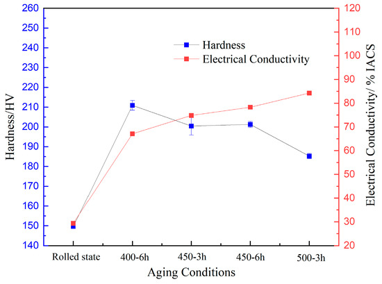 Figure 4 shows the variation diagram of average hardness and average electrical conductivity. As can be seen from Table 3, the electrical conductivity of the unaged rolled part is 29.25% IACS. After aging treatment at 400 °C for 6 h, the electrical conductivity of the rolled part reaches 67.07% IACS, which is approximately 1.3 times higher than that of the unaged rolled part. The electrical conductivity is 74.82% IACS after aging at 450 °C for 3 h, and 78.3% IACS after aging at 450 °C for 6 h. This indicates that the electrical conductivity shows a trend of monotonous growth with the extension of aging time. The electrical conductivity after aging at 500 °C for 3 h is 84.26% IACS. Therefore, it is shown that the electrical conductivity will be significantly improved with the increase in aging temperature.