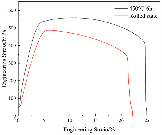 Based on the analysis of the hardness and electrical conductivity test results, the Cu-Cr-Zr alloy treated with aging at 450 °C for 6 h exhibits excellent comprehensive properties due to the synergistic strengthening effect of microscale Cr particles and Cr precipitates. Therefore, tensile property tests were conducted on both unaged samples and Cu-Cr-Zr alloy samples aged at 450 °C/6 h. The tensile strength and elongation parameters are shown in Table 4, and Figure 5 presents the stress–strain curves of the unaged samples and the Cu-Cr-Zr alloy samples aged at 450 °C/6 h. Analysis indicates that compared with the unaged samples, the tensile strength of the aged samples is increased by 14.46%, and the elongation is increased by 14.82%. In comparison, the Cu-Cr-Zr alloy in this study exhibits more excellent comprehensive properties than the Cu-0.7Cr-0.19Zr alloy aged at 425 °C for 5 h under similar conditions, which has a hardness of 137 ± 3, an electrical conductivity of 70.8 ± 2, and a tensile strength of 409 ± 3 [21].