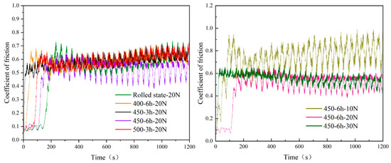 In this experiment, friction and wear coefficients were tested under a constant load of 20 N for as-rolled samples and those aged at 400 °C/6 h, 450 °C/3 h, 450 °C/6 h, and 500 °C/3 h (Figure 6). The horizontal axis represents the wear test time in seconds, the vertical axis represents the friction coefficient, and the curves reflect the variation in the alloy’s friction coefficient. From the as-rolled (20 N) curve in Figure 6, in the initial stage, the friction coefficient of the room-temperature as-rolled sample shows an up-and-down fluctuation trend, which may be due to the running-in process of the material surface. The friction coefficient increases rapidly until the wear test time reaches about 200 s. With the increase in wear time, the surface friction state tends to be stable, and the friction coefficient stabilizes with small fluctuations. Its average friction coefficient is approximately 0.6. The 400 °C/6 h aged sample shows a rapid initial friction coefficient increase, stabilizing with small fluctuations at ~100 s; its average is slightly below 0.6. The 450 °C/3 h aged sample exhibits a sharp initial rise in friction coefficient, stabilizing quickly with minimal fluctuations and an average still below 0.6. The 450 °C/6 h aged sample fluctuates initially, rises rapidly at ~100 s, and gradually stabilizes with larger fluctuations—its average also remains below 0.6. The 500 °C/3 h aged sample fluctuates first, rises rapidly at ~100 s, then stabilizes with small fluctuations, with an average friction coefficient of ~0.6.