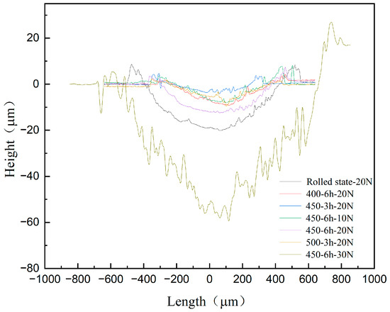 Figure 7 shows the two-dimensional contour diagrams of the rolled parts under different states and loads. It can be observed from the figures that the contours of the rolled parts in different states all show a certain degree of fluctuation along the length direction, which may be caused by changes in surface roughness or microstructure. When the rolled parts aged at 450 °C/6 h are subjected to loads of 10 N and 20 N, the fluctuation amplitude of the alloy’s contours is relatively gentle. However, under a load of 30 N, the fluctuation in the height direction is the most obvious for the rolled parts aged at 450 °C/6 h. This indicates that the surface of the Cu-Cr-Zr alloy will exhibit different depths under different loads after aging at 450 °C/6 h, suggesting significant differences in mass loss. After comprehensive evaluation, the samples aged at 450 °C/3 h and 450 °C/6 h show better wear resistance.
