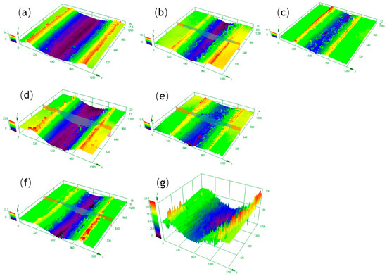 Figure 8 shows the three-dimensional (3D) maps of friction and wear, which clearly demonstrate the surface changes in the material after the test. The color bar represents the height or depth along the Z-axis, with colors ranging from purple to red indicating a change from low to high.