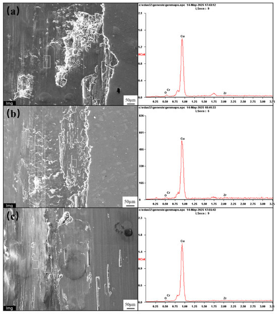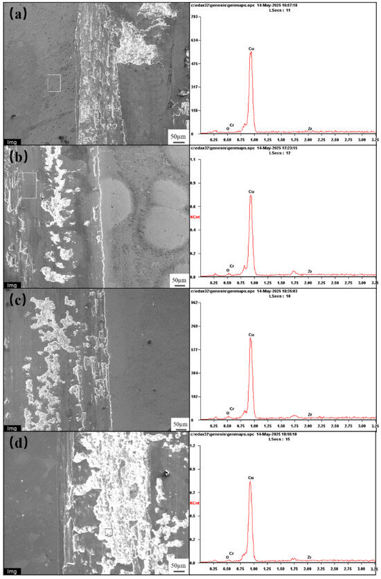 Differences in the magnification of friction and wear surface morphologies result in varying levels of detail presentation. At low magnification, relatively macroscopic wear surface features can be observed with a larger field of view, allowing the general shape and distribution of the wear area to be seen. At high magnification, the focus is on micro-details, revealing finer textures, microcracks, wear pits, and other microstructures on the wear surface—details that are difficult to distinguish at low magnification. More wear surface details, such as wear textures and local micro-defects, can be observed in Figure 9a,b. However, compared with Figure 9c,d, their detail fineness is slightly inferior. Nevertheless, they balance a certain range of field of view and detailed observation, making them suitable for analyzing the medium-scale features of the wear area. SEM images are mainly used to observe the surface morphology of samples, while energy spectrum diagrams are used to analyze the elemental composition of the sample surface. Through these energy spectrum diagrams, information such as the presence and relative content of elements in Cu-Cr-Zr alloy samples under different aging states can be confirmed.