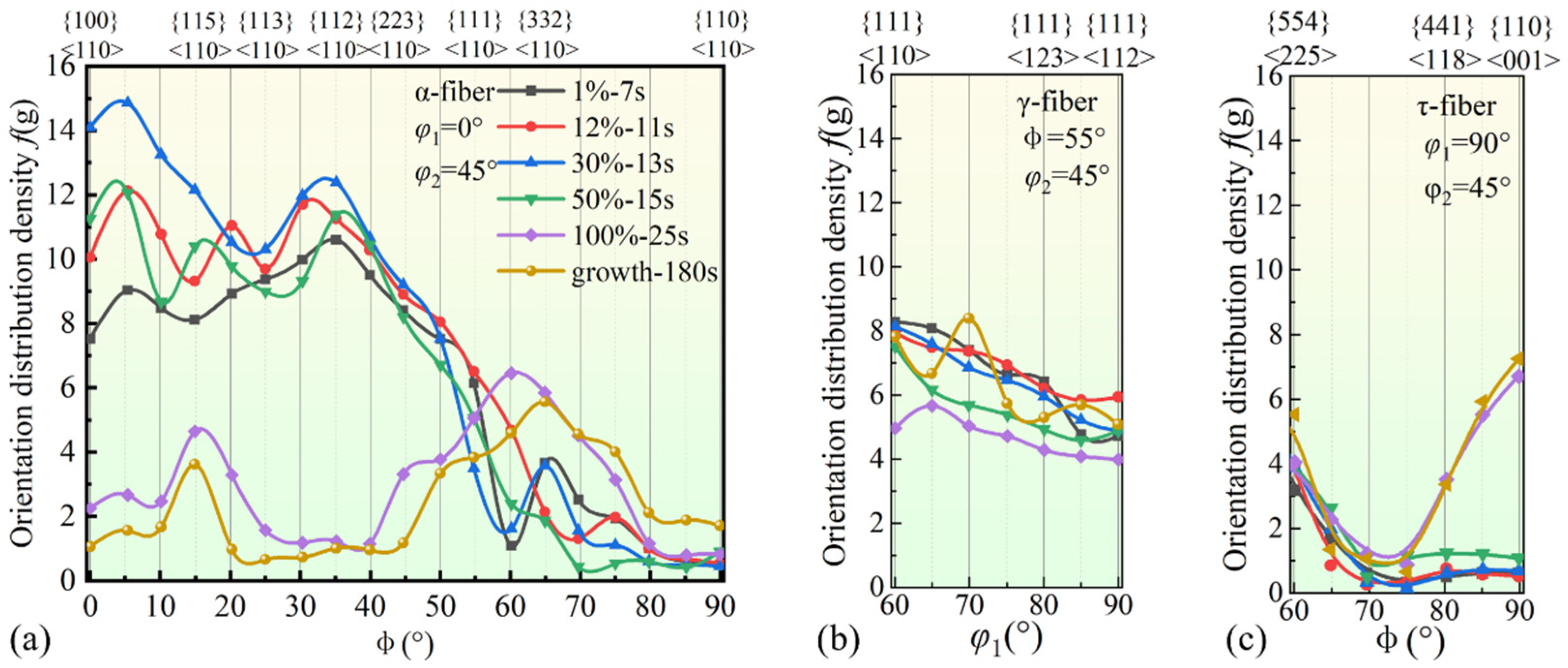 | Annealing Time (s) | Recrystallized Fraction | γ-Fiber (<111>//ND) | α-Fiber (<110>//RD) | Goss ({110}<001> | {554}<225> |