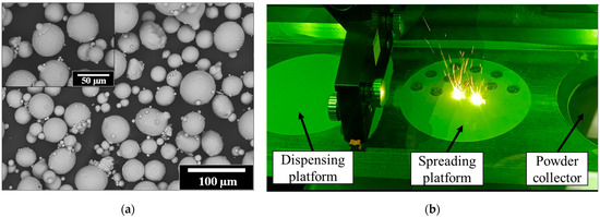 It is common knowledge that an adequate powder bed density and uniformity are essential to obtaining high quality LPBF parts, both in terms of printed density and geometric accuracy, and these outcomes depend significantly on the powder particle characteristics (size, sphericity, uniformity [36]). The gas-atomized pre-alloyed Ti6246 powder produced by Eckart TLS Gmbh (Bitterfeld-Wolfen, Germany) used in this study is highly spherical but with a certain amount of small satellite particles (see image in Figure 1a obtained using a Hitachi TM300 (Tokyo, Japan) scanning electron microscope). The initial powder particle size distribution (PSD) reported in [32] was measured using a Beckam Coulter LS13 320 XR particle size analyzer (Brea, CA, USA). To ensure that the powder was not mechanically segregated during recoating using a thinner layer thickness (25 µm), the PSDs inside three printer compartments, namely the dispensing and spreading platforms and the powder collector (Figure 1b), were measured for this layer thickness and found to be almost identical.