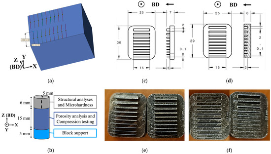 Schematic representation of the (a) cubic specimen with single tracks printed on its upper surface; (b) cylindrical specimen with samples used for various analyses. Drawings of the printed geometric artefacts: (c) walls and (d) gaps. Printed artefacts using 25 and 50 μm layer thicknesses: (e) walls and (f) gaps. All dimensions are in millimeters (mm). BD stands for “Build Direction”.