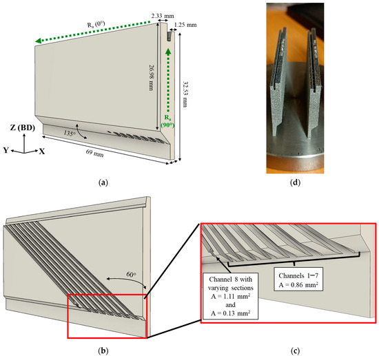 To provide an example of a more complex part, the pressure drop measurement artefacts containing eight 60°-oriented hollow channels were also printed (Figure 3a). Channels 1 to 7 were identical (A = 0.86 mm2), while Channel 8 was larger (A = 1.11 mm2), but contained a narrower part (A = 0.13 mm2) at one of its extremities (Figure 3b,c). Images of the printed pressure drop artefacts are shown in Figure 3d.
