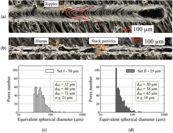 Optical observations of the continuous single tracks printed using (a) Set I and (b) Set II. Equivalent pore diameter distributions corresponding to a volume of 1 cm3: (c) Set I—50 µm, (d) Set II—25 µm; (cylindrical specimens).