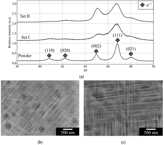 Figure 5a shows the results of the XRD analysis and highlights the formation of the orthorhombic α″ martensitic phase. For both cases, the confocal microscope observations revealed homogeneous microstructures with partially visible melt pool borders and typical columnar prior-β grains. Moreover, the higher magnification SEM observations shown in Figure 5b,c revealed a less than 2% difference in size of martensite needles, arranged in a cross-hatch pattern for both sets of parameters used (Table 2). This microstructure similarity is caused by the almost identical W/h ratio for two cases, leading to the same relative overlap R% (3) of two neighboring tracks. Thus, even though the single track width for Set I was significantly larger that for Set II, this difference was compensated by a much larger hatching space for Set I than for Set II, thus enabling the formation of identical microstructures. The calculated R% values for the two sets of parameters are presented in Table 2.