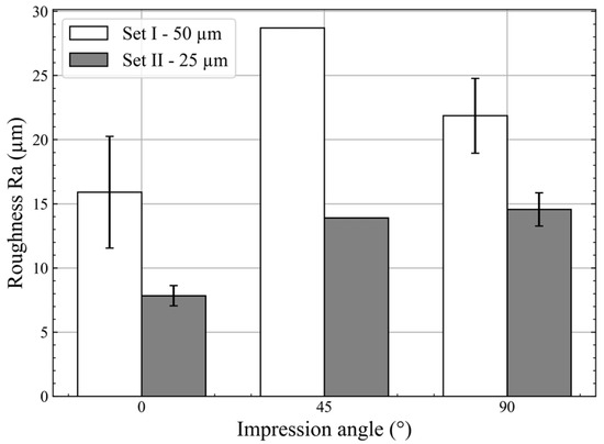 For each of the two layer thicknesses, the Ra values measured for the 0° (top) and 90° (lateral) oriented surfaces of the pressure drop artefacts are summarized in Figure 6. As commonly observed [43,44], the lateral surfaces were significantly rougher than the top surfaces. Moreover, for both surface orientations, the surface roughness of Set I artefacts (t = 50 µm) was significantly higher than that of their Set II counterparts (t = 25 µm), where thicker layers caused (a) a greater propensity to ripple formation on the top surfaces (see Section 3.1.2 for explanation) and (b) a larger distance between layers on the lateral surfaces.