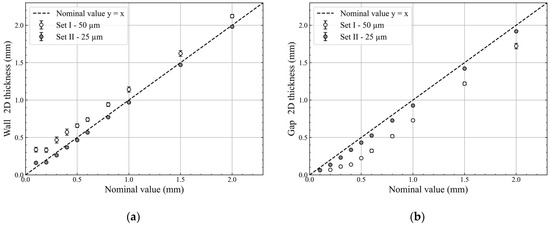 The 0.1 and 0.2 mm-thick wall/gap features must be considered on their own merits, as they represent exceptional cases that fall within the range of single track widths, being formed by only one laser path (Table 2). In the case of wall artefacts, these two features had the same average thicknesses. However, the difference with the nominal values is greater for Set I than for Set II because of the wider melt pools (single tracks) in the former case (Figure 7a). Note that the wall thicknesses reported here are slightly larger than those reported for single tracks in Section 3.1.2 (ΔW ≈ 20–30 µm) due to the thermal history of the powder bed, which can vary between the prints (e.g., the number of parts on the build plate, the printing parameters used for surrounding parts, etc.). According to these observations, the thinnest printable wall thickness corresponds roughly to the single track width, i.e., 0.3 mm for Set I and 0.15 mm for Set II (Figure 7a). Given the substantial width of melt pools (single tracks) for Set I, gaps with a nominal width smaller than 0.2 mm were almost fully clogged, but they were printable with Set II (Figure 7b). For both layer thicknesses, the gaps were narrower than their nominal values, due to particles partially-melted to their edges, with these deviations being systematically greater for Set I artefacts as compared to their Set II equivalents. This behavior is consistent with the single track analyses (Figure 4a,b).