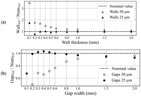 Evolution of the segmented 3D volume compared to the nominal volume for both parameter sets for (a) walls and (b) gaps. In each figure, black dashed lines correspond to the nominal thickness of features.