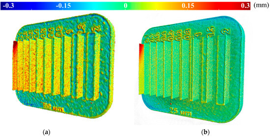 A 3D visualization of the deviation map compared to the CAD for walls printed with (a) Set I (t = 50 µm), (b) Set II (t = 25 µm).