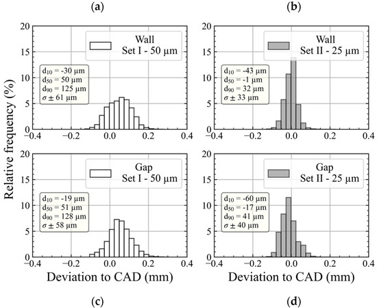 Figure 10 represent the statistical distribution of the deviations computed inside the map used for 3D rendering. Overall, the distributions obtained for walls and gaps printed with Set II were narrower, with lower standard deviations and a median value centered around 0 mm (Figure 10b,d). Conversely, due to the aforementioned reasons regarding the melt pool continuity, the specimens printed with Set I had larger standard deviations and shifted median values (Figure 10a,c).